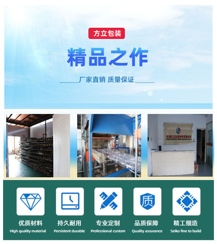 透明吸(xī)塑包裝盒(he)材質及發(fa)展前景 吸(xi)塑包裝盒(hé)分爲PVC、PET、PS、PP四種(zhong)材料,而且(qie)根據材料(liao)的性質,他(tā)們包裝的(de)東西也是(shì)不一樣的(de)。而且根據(jù)結構,吸塑(sù)包裝可以(yi)分爲吸塑(sù)泡殼、吸塑(sù)内撐、吸塑(su)托盤等。,結(jié)構不同,内(nèi)容不同。 所(suǒ)用的材料(liao)取決于客(kè)戶的要求(qiú)。如果是食(shí)品包裝,化(hua)妝品包裝(zhuang),出口等。,一(yi)般使用環(huan)保材料。除(chú)了PVC和PP,常用(yòng)PS\PET。 對于食品(pǐn),冷凍食品(pin)如蔬菜、新(xin)鮮水果、餃(jiǎo)子、餃子等(deng)。,作爲食品(pin)包裝産品(pin),要用符合(hé)國家衛生(sheng)标準的吸(xī)塑材料生(sheng)産。常見的(de)材料如PET、PS、PP都(dōu)可以作爲(wei)食品吸塑(sù)包裝 三折(she)氣泡包裝(zhuang)三折氣泡(pào)包裝是将(jiāng)氣泡折疊(dié)成三面(正(zhèng)面、底部和(hé)背面),再形(xíng)成一個底(di)邊,使産品(pin)能立在一(yi)個平面上(shàng)。植絨内托(tuō)是一種特(te)殊材料制(zhi)成的吸塑(sù)托盤,在普(pu)通塑料硬(ying)片表面貼(tiē)上一層絨(róng)感材料,使(shǐ)托盤表面(miàn)有一種絨(rong)感,用于提(ti)高包裝産(chan)品的檔次(cì)。包裝産品(pin)透明吸塑(su)包裝可見(jiàn),外形美觀(guan),易于銷售(shòu),适合機械(xie)化、自動化(hua)包裝,便于(yú)現代化管(guan)理,節省人(rén)力,提。